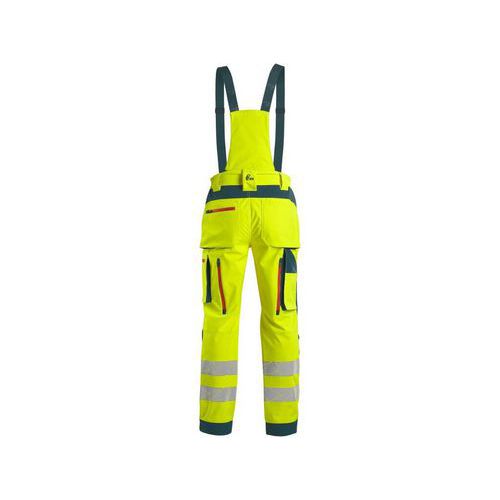 Męskie spodnie softshell o wysokiej widoczności, zaprojektowane z myślą o doskonałej widoczności i maksymalnym komforcie. Spodnie posiadają odpinane szelki z regulacją rozmiaru, pas z gumką po bokach oraz antypoślizgowy nadruk od wewnątrz. Praktyczne kieszenie z przodu, z tyłu i na udach zapewniają wiele możliwości przechowywania. Ergonomicznie wyprofilowane kolana wzmocnione są wytrzymałym materiałem ripstop. Spodnie wyposażone są również w segmentowane taśmy odblaskowe o szerokości 6 cm, kontrastowe dodatki w kolorze czerwonym HV i petrol, membranę ULTRA TPU, wentylację zapinaną na zamek z siateczką oraz trwałe wzmocnienia nogawek. Materiał charakteryzuje się wodoodpornością 5000 mm² poza szwem oraz paroprzepuszczalnością 5000 g/m²/24h. System EASY-PROLONG pozwala na dopasowanie kroju do sylwetki osoby o wyższej sylwetce poprzez rozpięcie szwów na nogawkach. Zastosowanie zalecane: budownictwo, drogowcy, kierowcy, transport lotniczy i morski, logistyka, kierowcy ciężarówek, policja. P