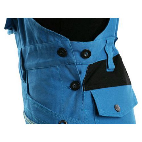 Damskie ogrodniczki robocze, tkanina stretch zapewniająca swobodny ruch, kieszeń na piersi z patką, szlufki na pasek, z przodu kieszonka na zamek, z boku kieszenie wielofunkcyjne, kolana wzmocnione poliesterem 600D, dwie tylne kieszenie - jedna z pat Velikost: 38-58 Reflexní doplňky: Ano