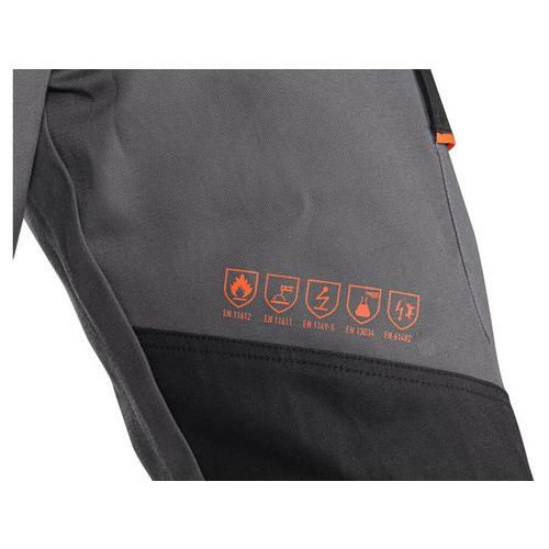 Męskie spodnie ochronne, antystatyczne, z trwałą ochroną trudnopalną PROBAN i powłoką odporną na ciekłe chemikalia typu 6 i typu PB [6]. Nadają się również do prac pod napięciem zgodnie z normą EN 61482. Pas z gumką po bokach i szlufkami na pasek, kieszenie przednie i boczne zapinane na rzep, kieszenie tylne zapinane na rzep. Elementy odblaskowe zwiększają bezpieczeństwo w miejscach o ograniczonej widoczności. Spodnie wyposażone są w system EASY-PROLONG, który umożliwia łatwe dopasowanie kroju do sylwetki wyższej poprzez rozpięcie szwów na nogawkach. Zalecane zastosowanie: spawacze, przemysł petrochemiczny, energetyka, gazownictwo i rafinerie, prace pod napięciem, prace na elektrowniach wiatrowych. Odzież spełnia powyższe normy tylko wtedy, gdy noszony jest cały komplet bluza + spodnie. Akcesoria odblaskowe: Tak System EASY-PROLONG: Tak Rozmiar: 46-64