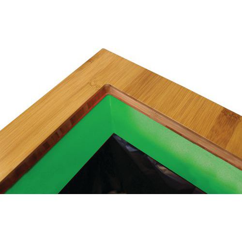 - Stacja selektywnego sortowania z ocynkowanej stali z elegancką i trwałą pokrywą z bambusa, z kolorowym wskaźnikiem przepływu i etykietą.