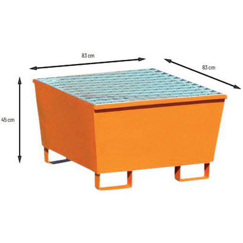 Stalowe wanny wychwytowe do przechowywania 1 – 4 beczek o pojemności 200 l. Nadają się do przechowywania substancji zagrażających wodzie, odporne na rozpuszczalniki i węglowodory. Część nośną tworzy wyciągany ocynkowany ruszt. Łatwe manewrowanie za pomocą wózka widłowego lub wózka paletowego, manipulacja ładunkiem jest możliwa tylko w odniesieniu do wanien na 1 beczkę. Wanny wychwytowe są z dwóch stron spawane, co zapewnia wodoszczelność. Dostępne w wersji ocynkowanej lub lakierowanej w kolorze pomarańczowym RAL 2000. Maks. obciążenie statyczne (kg) : 1000 kg Gwarancja producenta dla klienta : 10 lat