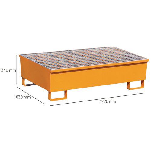Stalowe wanny wychwytowe do przechowywania 1 – 4 beczek o pojemności 200 l. Nadają się do przechowywania substancji zagrażających wodzie, odporne na rozpuszczalniki i węglowodory. Część nośną tworzy wyciągany ocynkowany ruszt. Łatwe manewrowanie za pomocą wózka widłowego lub wózka paletowego, manipulacja ładunkiem jest możliwa tylko w odniesieniu do wanien na 1 beczkę. Wanny wychwytowe są z dwóch stron spawane, co zapewnia wodoszczelność. Dostępne w wersji ocynkowanej lub lakierowanej w kolorze pomarańczowym RAL 2000. Gwarancja producenta dla klienta : 10 lat Maks. obciążenie statyczne (kg) : 1000 kg