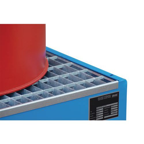 Możliwość uzupełnienia o wyposażenie – ocynkowany ruszt, zestaw 2 kół skrętnych (w tym 1 z blokadą) z ocynkowanym uchwytem, podłużne dodatkowe listwy ułatwiające ułożenie wanny na belkach regałów paletowych, ocynkowany stojak na beczkę do przechowywania jednej beczki o pojemności 200 l, ocynkowana nadbudowa wałkowa do osadzenia na stojaku beczki, zadaszenie wanny wychwytowej z zamykanymi na klucz drzwiami