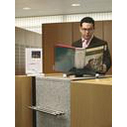 - Stojak stołowy z 10 tabliczkami informacyjnymi w formacie A4. Posiada powłokę przeciwpoślizgową, dzięki której stojak nie przemieszcza się samoistnie po gładkiej powierzchni. Pojemność maksymalna wynosi 100 tabliczek, dzięki możliwości rozbudowy uchwytu. Wykonany z włókna szklanego w kolorze czarno-białym, kieszenie z polipropylenu w kolorze czerwonym i czarnym.