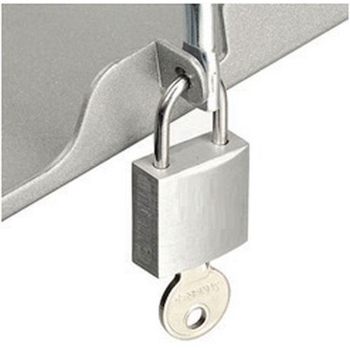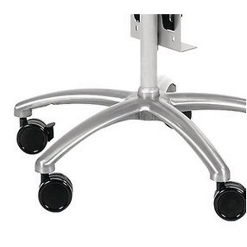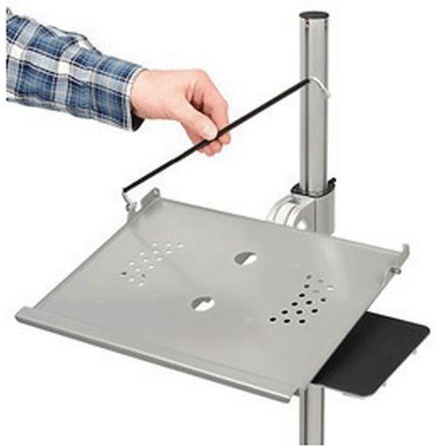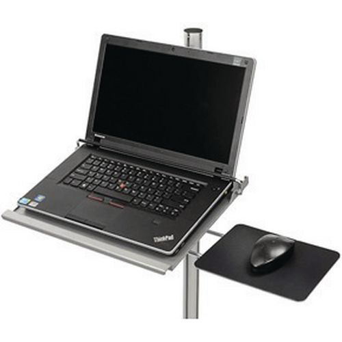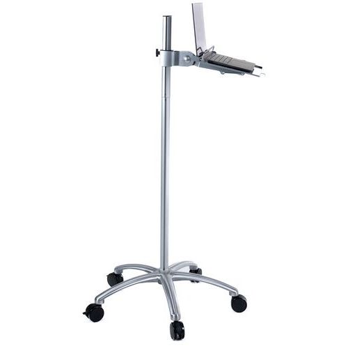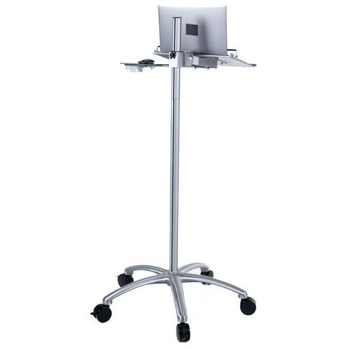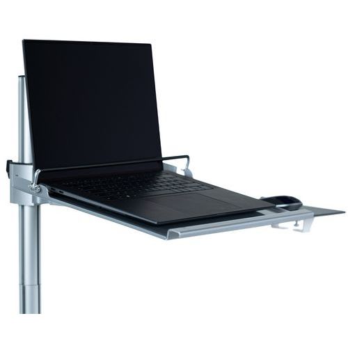 Mobilny stojak z regulacją wysokości, na notebook, z wbudowanym uchwytem myszy. Zamykany na klucz pręt zabezpieczający przed kradzieżą notebooka. Kółko hamujące do ustalania położenia stojaka. Maks. obciążenie (kg) : 5 kg