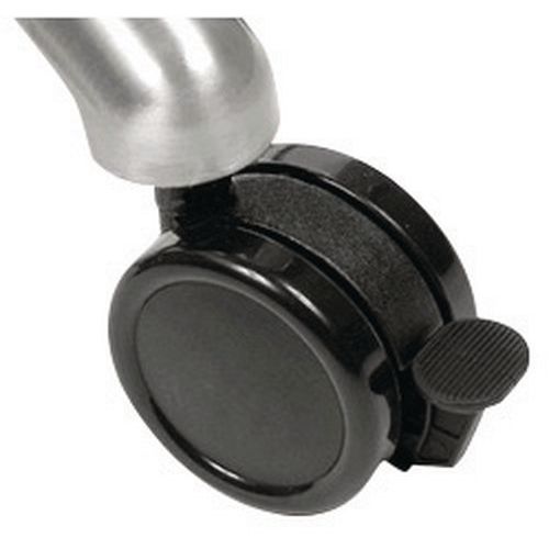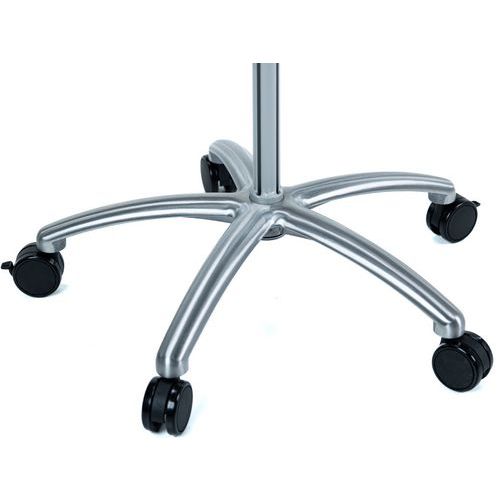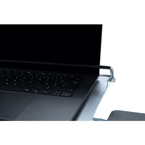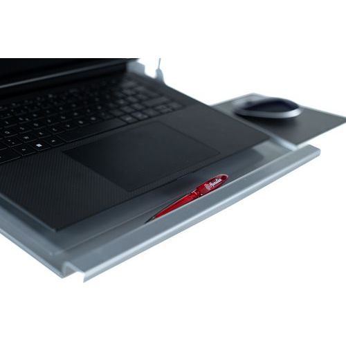 Mobilny stojak z regulacją wysokości, na notebook, z wbudowanym uchwytem myszy. Zamykany na klucz pręt zabezpieczający przed kradzieżą notebooka. Kółko hamujące do ustalania położenia stojaka.