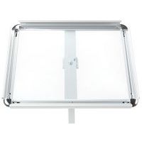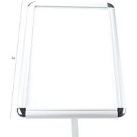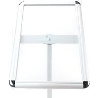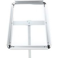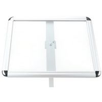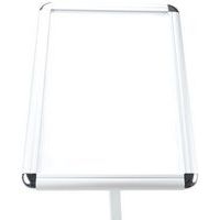 Wygięty metalowy stojak na broszury i ulotki informacyjne. Tablica z zaokrąglonymi rogami. Pionowy układ.