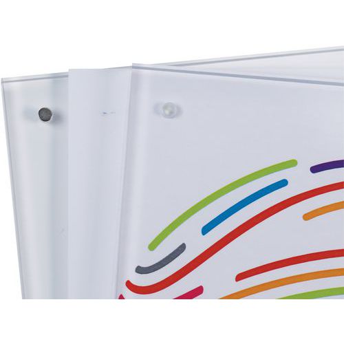 Przezroczyste plastikowe stojaki do umieszczania ulotek, informacji, menu obiadowego, można je wykorzystać także jako ramkę na fotografię. Dokumenty umieszcza się pomiędzy plastikowymi tablicami, zamknięcie za pomocą 4 punktów magnetycznych w każdym rogu. Możliwość zastosowania poziomego lub pionowego układu prezentacji.