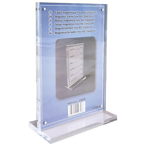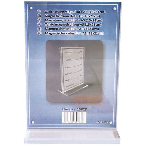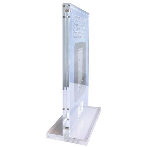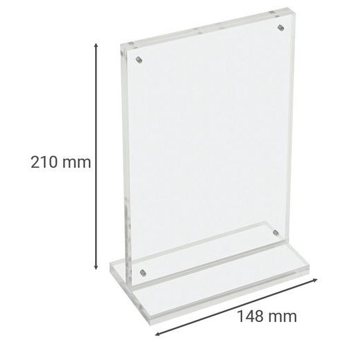 Akrylowa ramka T na ulotki reklamowe, informacje, menu obiadowe, fotografie itp. Układ pionowy. Łatwy sposób umieszczania dokumentu pomiędzy plastikowymi tablicami, stabilne mocowanie za pomocą punktów magnetycznych.