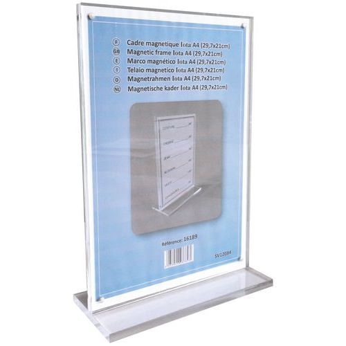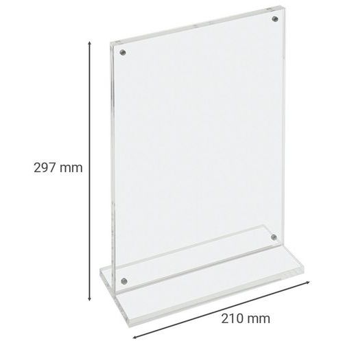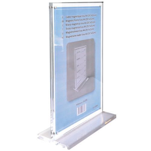 Akrylowa ramka T na ulotki reklamowe, informacje, menu obiadowe, fotografie itp. Układ pionowy. Łatwy sposób umieszczania dokumentu pomiędzy plastikowymi tablicami, stabilne mocowanie za pomocą punktów magnetycznych.