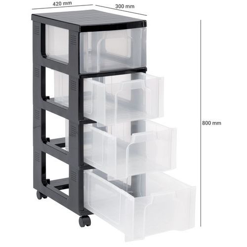 Plastikowy stojak z wysuwanymi pudełkami do przechowywania dokumentów i różnych przedmiotów. Stojak wyposażony jest w cztery koła, które zapewniają prostą mobilność i zwrotność. Pudełka są przezroczyste, co pozwala na szybki przegląd ich zawartości, wyposażone są w uchwyt umożliwiający szybkie wyciągnięcie. Szczelne zamknięcie zapewnia maksymalną ochronę przed kurzem.