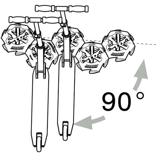 Stojaki pod hulajnogę o przemyślanej konstrukcji, kompatybilne ze wszystkimi modelami. Aby zachować odpowiednią odległość, można ustawić dwie sztuki jedna na drugiej. Kompatybilność szerokości kół: wszystkie koła od 25 do 38 mm. Stojaki na hulajnogę można przymocować do podłoża za pomocą otworu znajdującego się na osi środkowej.