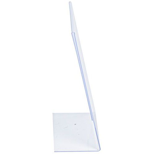 Bezbarwne stojaki stołowe L na prospekty, w układzie pionowym. Prezentacja jednostronna. Prospekty umieszcza się od boku. Gwarancja producenta dla klienta : 10 lat