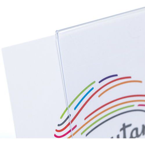 Bezbarwne stojaki stołowe L na prospekty, w układzie pionowym. Prezentacja jednostronna. Prospekty umieszcza się od boku.
