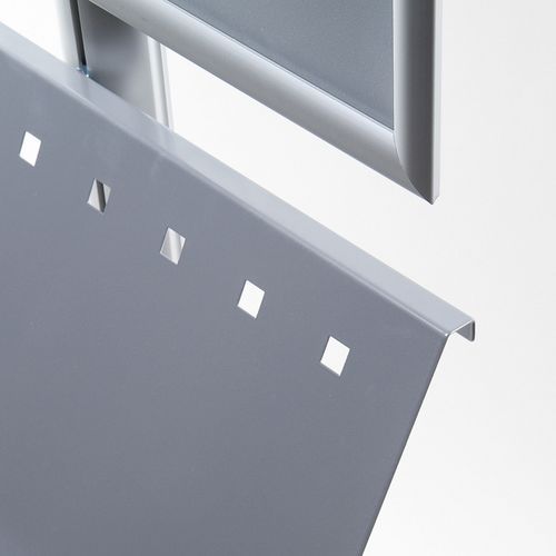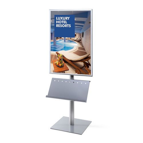 Stojaki informacyjne z ramą na plakaty. W części dolnej znajduje się przestrzeń do umieszczenia blaszanych kieszeni na broszury, katalogi i inne prospekty. Rama zatrzaskowa z ostrymi rogami i profilem 25 mm. Wyprodukowany w UE