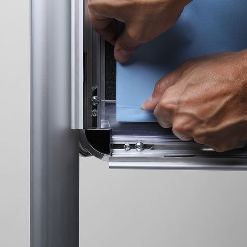 Trzystronne stojaki reklamowe z ramami zatrzaskowymi i profilem ramy 32 mm. Stojaki mają wysoką stabilność dzięki aluminiowym nogom. Tablice reklamowe posiadają zwiększoną odporność na niekorzystne warunki atmosferyczne oraz rdzewienie. Wyprodukowany w UE