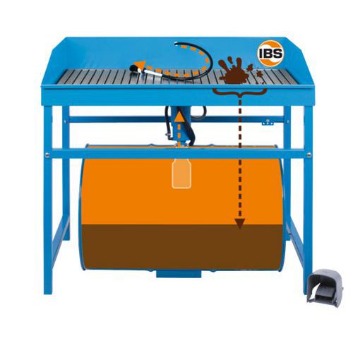 Po wciśnięciu wyłącznika nożnego uruchamiana jest pompa, podczas czyszczenia zanieczyszczonych elementów, użyta ciecz spływa z powrotem do beczki, gdzie zabrudzenia ulegają oddzieleniu i osadzają się na dnie beczki.