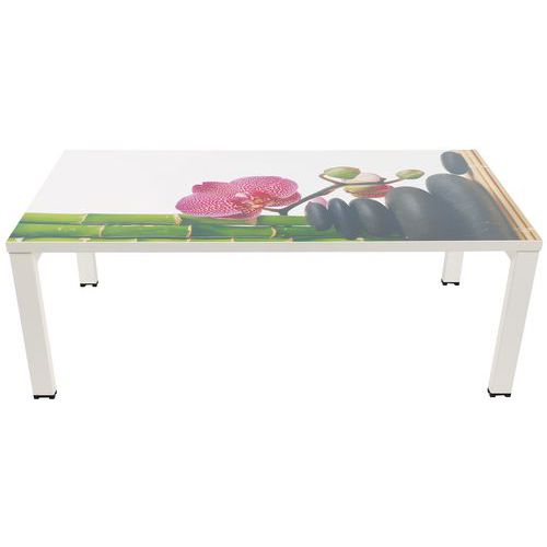 Prostokątny stolik konferencyjny w kolorowym designie, przeznaczony do biur, holi itp. Wysoką stabilność zapewnia metalowa lakierowana konstrukcja z profili 50 x 30 mm. Blat stołu posiada obrzeża PCW o gr. 2 mm. Nogi wyposażone w plastikowe stopki zapobiegające rysowaniu podłogi. Gwarancja producenta dla klienta : 10 lat