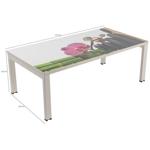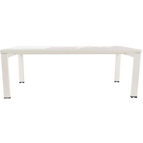 Prostokątny stolik konferencyjny w kolorowym designie, przeznaczony do biur, holi itp. Wysoką stabilność zapewnia metalowa lakierowana konstrukcja z profili 50 x 30 mm. Blat stołu posiada obrzeża PCW o gr. 2 mm. Nogi wyposażone w plastikowe stopki zapobiegające rysowaniu podłogi.