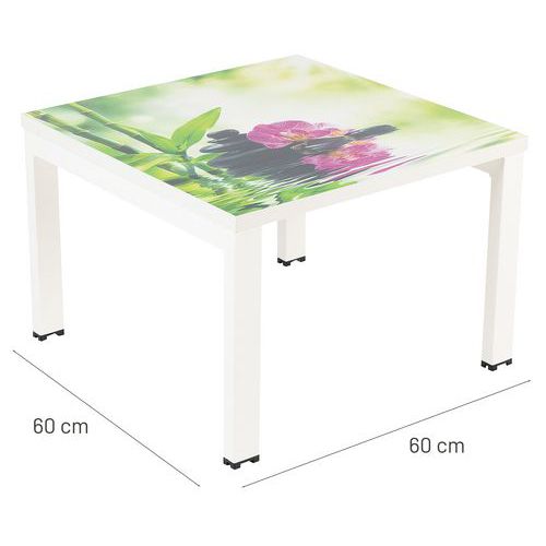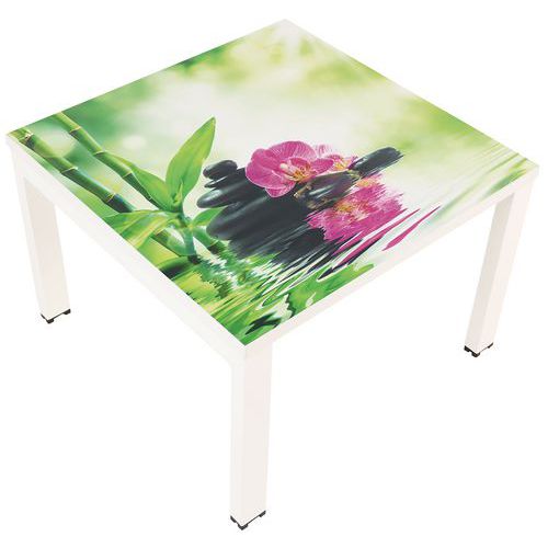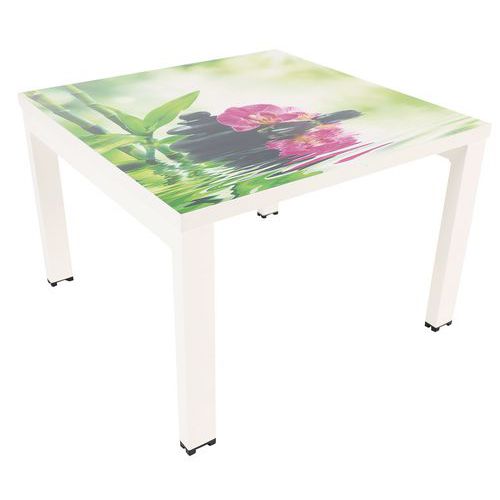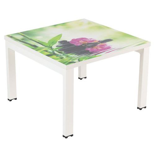 Kwadratowy stolik konferencyjny w kolorowym designie, przeznaczony do biur, holi itp. Wysoką stabilność zapewnia metalowa lakierowana konstrukcja z profili 50 x 30 mm. Blat stołu posiada obrzeża PCW o gr. 2 mm. Nogi wyposażone w plastikowe stopki zapobiegające rysowaniu podłogi. Gwarancja producenta dla klienta : 10 lat