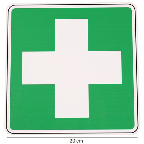 Znaki bezpieczeństwa z symbolem pierwszej pomocy, które pozwalają szybko znaleźć niezbędne wyposażenie ratunkowe.