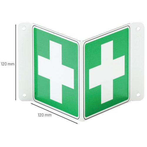 Znaki bezpieczeństwa z symbolem pierwszej pomocy, które pomogą Ci szybko znaleźć potrzebny sprzęt ratunkowy.