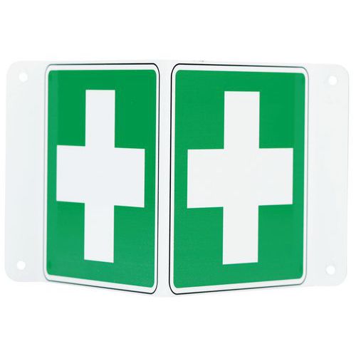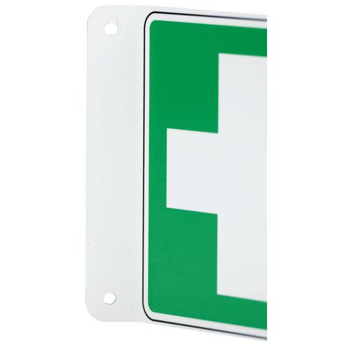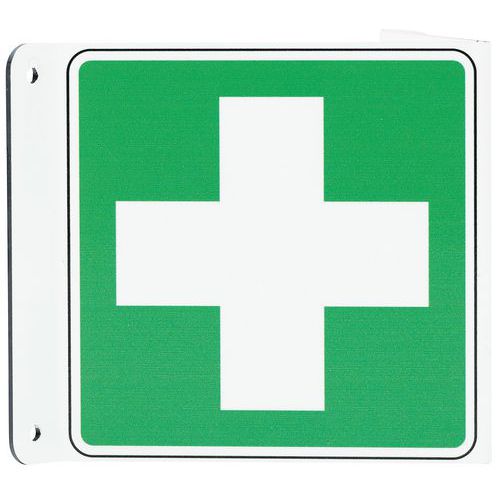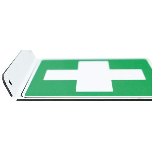 Znaki bezpieczeństwa z symbolem pierwszej pomocy, które pomogą Ci szybko znaleźć potrzebny sprzęt ratunkowy.