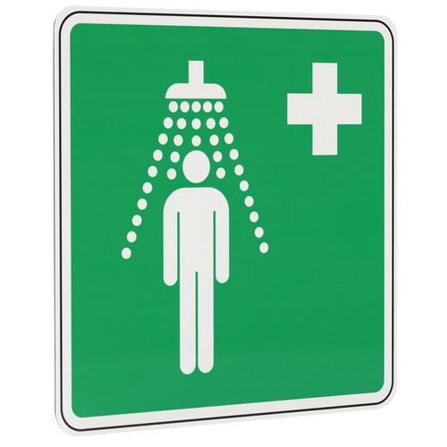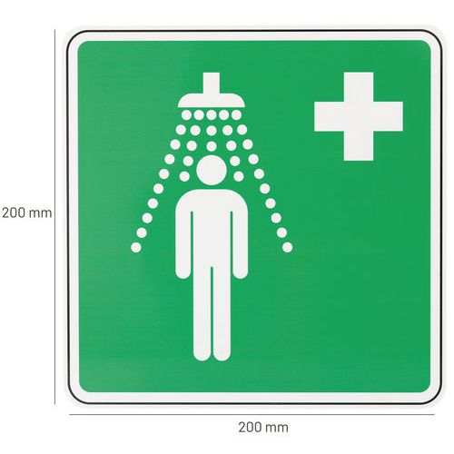 Te znaki bezpieczeństwa ostrzegają o obecności prysznica medycznego.