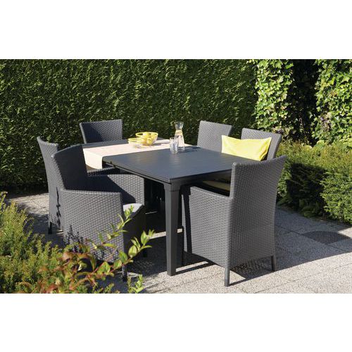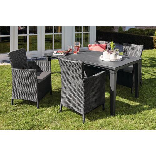 - Plastikowy stolik do siedzenia na zewnątrz na tarasie, pergoli lub w ogrodzie.