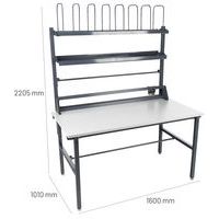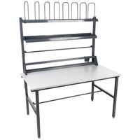 Kompletne stanowiska do pakowania towarów w magazynach, centrach wysyłkowych itp. Blat o grubości 20 mm z laminowanej płyty wiórowej. Półka na akcesoria z regulacją wysokości, wysokość 1400/1500 mm. Półka o regulowanej wysokości z 8 przegrodami, wysokość 1800/1900 mm. Wysokość stołu z blatem: 867 mm. Zintegrowany bezpieczny nóż o maksymalnej długości cięcia 1250 mm, odpowiedni do papieru i folii bąbelkowej. Oś do mocowania papieru do pakowania lub folii powyżej i poniżej stołu 40 x 1375 mm. Śruby do wyrównywania nierówności podłogi.