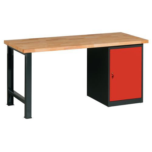 Stół warsztatowy Weld, dostępny w dwóch wariantach kolorystycznych, składa się z blatu roboczego, wytrzymałej podstawy i szafki.