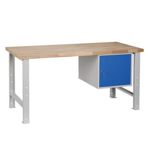 Stół warsztatowy Weld, dostępny w dwóch wariantach kolorystycznych, składa się z blatu roboczego, wytrzymałej podstawy i szafki.