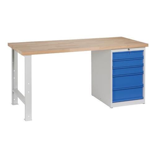 Stół warsztatowy Weld, dostępny w dwóch wariantach kolorystycznych, składa się z blatu roboczego, wytrzymałej podstawy i kontenera z pięcioma szufladami.