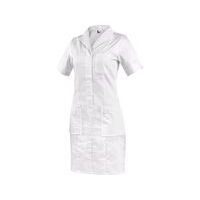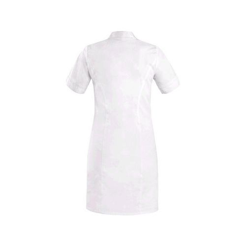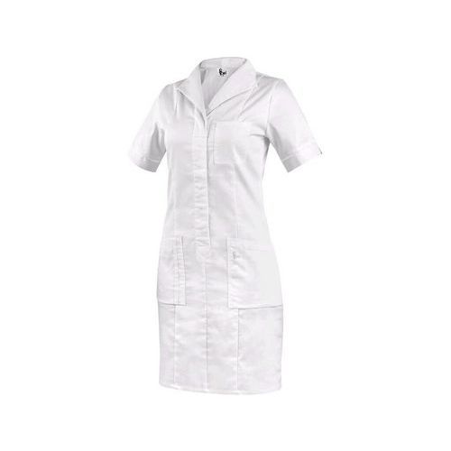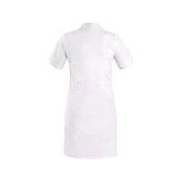 Sukienka damska z krótkimi rękawami, z przodu i z tyłu wykończona szwem typu „księżniczka”, wygodnym otwartym dekoltem, długość do kolan, zapięcie na kryte napy dziecięce, kieszeń na piersi po lewej stronie, 2 dolne kieszenie naszywane z luźnym dolnym brzegiem. Zastosowanie zalecane: gabinety odnowy biologicznej, salony kosmetyczne, gabinety prywatne, kliniki i duże placówki służby zdrowia, ośrodki spa, instytucje opieki społecznej, apteki, szkoły o profilu medycznym. Normy: EN ISO 13688 Materiał wierzchni: 62% bawełna, 35% poliester, 3% elastan Rozmiar: 38-58