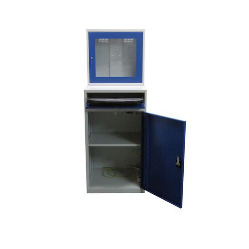 - Zamykana na klucz szafa warsztatowa służy do bezpiecznego przechowywania wyposażenia komputerowego w warsztatach, wykonana z blachy stalowej. Szafa jest podzielona na trzy niezależnie zamykane części, część środkowa z zamykanymi na klucz opuszczanymi drzwiczkami i wysuwaną półką na klawiaturę oraz mysz. Monitor można przymocować do ściany tylnej, na której przygotowano otwory w standardzie VESA (75 x 75 mm i 100 x 100 mm). Stopień ochrony IP20 (zabezpiecza przed wnikaniem ciał stałych).