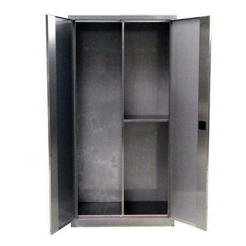- Szafa warsztatowa spawana w całości ze stali nierdzewnej, wewnątrz podzielona ścianką działową na dwie połówki: część po lewej stronie szafy oferuje pustą przestrzeń, natomiast w połowie wysokości części po stronie prawej umieszczono jedną półkę. Szafę można zamknąć na zamek cylindryczny z dwupunktowym mechanizmem ryglującym. Odpowiednia do pomieszczeń, w których wymagana jest odporność chemiczna i dobre parametry higieniczne.