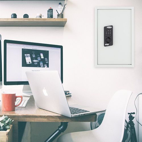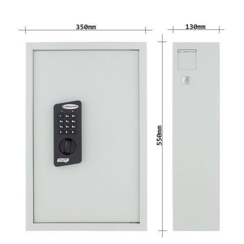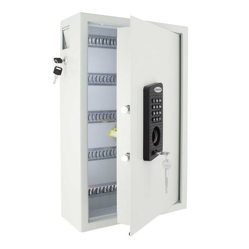 - Stalowa szafka na klucze z zamkiem elektronicznym i otworem bocznym do wrzucania kluczy do szafki.