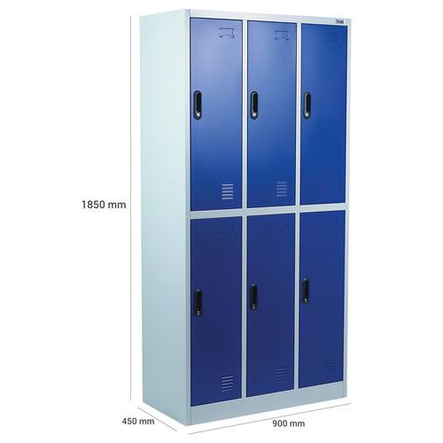 Stalowa szafka szatniowa z sześcioma oddzielnie zamykanymi boksami. Każdy z boksów jest zamykany za pomocą zamka z wkładką cylindryczną, w zestawie 2 klucze do każdego boksu. Stalowa szafka szatniowa z sześcioma oddzielnie zamykanymi boksami. Drzwi szafki są zawieszone na zawiasach wewnętrznych. Każdy z boksów jest zamykany za pomocą zamka z wkładką cylindryczną, w zestawie 2 klucze do każdego boksu. Każdy boks jest wyposażony w pręt do zawieszenia ubrań. Możliwość umieszczenia etykiety z nazwiskiem na drzwiczkach. Korpus wykonany z blachy stalowej o gr. 0,6 mm. Grubość blachy : 6/10e Montaż : Do montażu Gwarancja producenta dla klienta : 10 lat