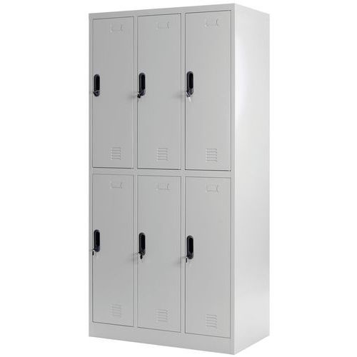 Stalowa szafka szatniowa z sześcioma oddzielnie zamykanymi boksami. Każdy z boksów jest zamykany za pomocą zamka z wkładką cylindryczną, w zestawie 2 klucze do każdego boksu. Stalowa szafka szatniowa z sześcioma oddzielnie zamykanymi boksami. Drzwi szafki są zawieszone na zawiasach wewnętrznych. Każdy z boksów jest zamykany za pomocą zamka z wkładką cylindryczną, w zestawie 2 klucze do każdego boksu. Każdy boks jest wyposażony w pręt do zawieszenia ubrań. Możliwość umieszczenia etykiety z nazwiskiem na drzwiczkach. Korpus wykonany z blachy stalowej o gr. 0,6 mm.