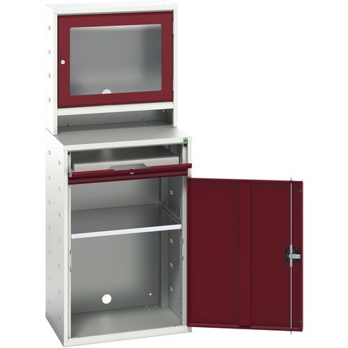 Szafka komputerowa odpowiednia do bezpiecznego przechowywania i użytkowania sprzętu PC w miejscu pracy. Spawana konstrukcja stalowa, powierzchnia malowana proszkowo. Oddzielnie zamykana, wentylowana komora na monitor z okienkiem. Zamykana szafka dolna z przepustami kablowymi. Zamykana szuflada na klawiaturę i mysz 1 ocynkowana półka z regulacją wysokości.