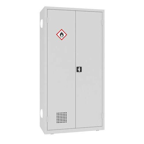 Drzwi wahadłowe posiadają otwory wentylacyjne zapewniające cyrkulację powietrza oraz są oznaczone etykietą GHS-02 służącą do identyfikacji standardowych zagrożeń chemicznych.