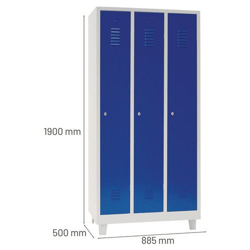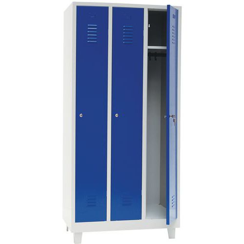 Szafka szatniowa o konstrukcji spawanej, Manutan Expert DURO PROFI na nóżkach, 3 przedziały, szary/niebieski