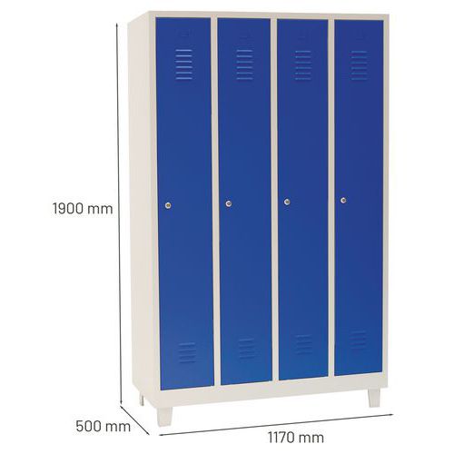 Szafka szatniowa o konstrukcji spawanej, Manutan Expert DURO PROFI na nóżkach, 4 przedziały, szary/niebieski