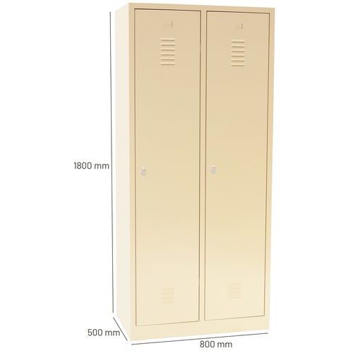 Szafy do szatni o konstrukcji spawanej, w jakości premium, składające się z dwóch zamykanych przedziałów, przy czym każdy przedział jest podzielony pionowo ścianką umożliwiającą odkładanie osobno czystych i brudnych ubrań.