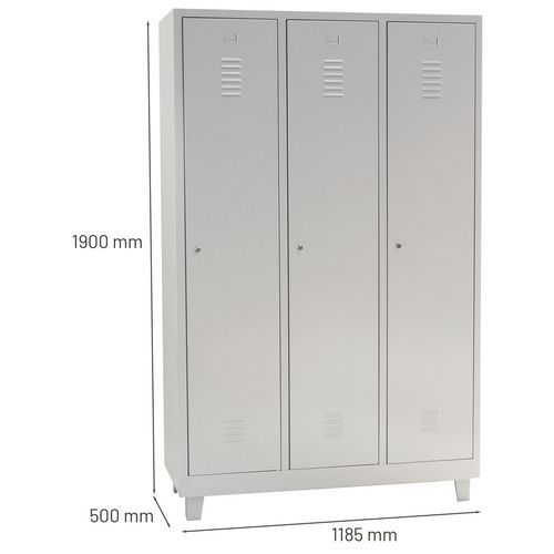 Szafy do szatni o konstrukcji spawanej, w jakości premium, składające się z trzech zamykanych przedziałów, przy czym każdy przedział jest podzielony pionowo ścianką umożliwiającą odkładanie osobno czystych i brudnych ubrań.