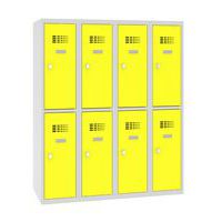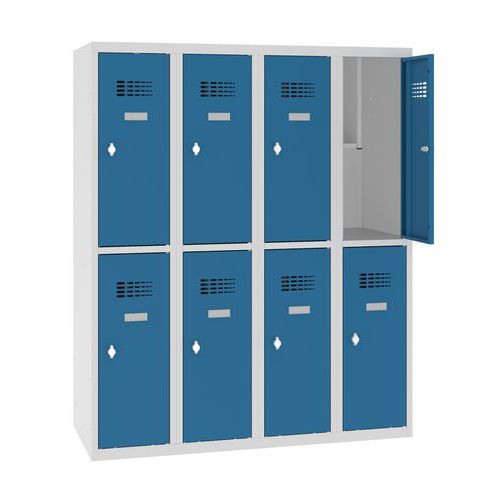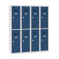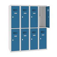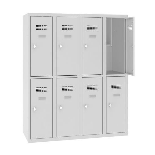 Niższe szafki szatniowe o konstrukcji spawanej, z ośmioma odrębnie zamykanymi boksami.