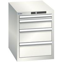 Szafki warsztatowe Lista z szufladami, 4 szuflady. Zamek na klucz. Optymalne wykorzystanie dzięki pełnemu wysuwowi i optymalnej wysokości frontu szuflady. Doskonała ochrona przed kurzem, cieczami i uszkodzeniami mechanicznymi dzięki zamkniętej ramie z powierzchnią odporną na uderzenia i ścieranie. System zabezpieczający przed wypadnięciem szuflady oraz blokada każdej szuflady osobno. Ochrona antykorozyjna poprzez elektroforetyczne malowanie zanurzeniowe i natryskiwanie. Zoptymalizowana przestrzeń do przechowywania i organizacja dzięki przegródkom LISTA dostosowanym do każdego zastosowania oraz szufladom wyposażonym w rowki i perforacje. Profesjonalne etykietowanie z oprogramowaniem LISTA Script i odchylanym uchwytem na etykiety. Idealnie cichy ruch dzięki prowadnicy bez poprzeczki. Przegródki do szuflad nie są dołączone. Należy je zakupić osobno.