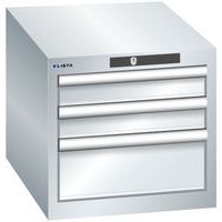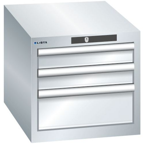 Szafki warsztatowe Lista z szufladami, 3 lub 4 szufladami. Zamek na klucz. Optymalne wykorzystanie dzięki pełnemu wysuwowi i optymalnej wysokości frontu szuflady. Doskonała ochrona przed kurzem, cieczami i uszkodzeniami mechanicznymi dzięki zamkniętej ramie z powierzchnią odporną na uderzenia i ścieranie. System zabezpieczający przed wypadnięciem szuflady oraz blokada każdej szuflady osobno. Ochrona antykorozyjna poprzez elektroforetyczne malowanie zanurzeniowe i natryskiwanie. Zoptymalizowana przestrzeń do przechowywania i organizacja dzięki przegródkom LISTA dostosowanym do każdego zastosowania oraz szufladom wyposażonym w rowki i perforacje. Profesjonalne etykietowanie z oprogramowaniem LISTA Script i odchylanym uchwytem na etykiety. Idealnie cichy ruch dzięki prowadnicy bez poprzeczki Przegródki do szuflad nie są dołączone. Należy je zakupić osobno. Maks. obciążenie (kg) : 75 kg