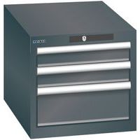 Szafki warsztatowe Lista z szufladami, 3 lub 4 szufladami. Zamek na klucz. Optymalne wykorzystanie dzięki pełnemu wysuwowi i optymalnej wysokości frontu szuflady. Doskonała ochrona przed kurzem, cieczami i uszkodzeniami mechanicznymi dzięki zamkniętej ramie z powierzchnią odporną na uderzenia i ścieranie. System zabezpieczający przed wypadnięciem szuflady oraz blokada każdej szuflady osobno. Ochrona antykorozyjna poprzez elektroforetyczne malowanie zanurzeniowe i natryskiwanie. Zoptymalizowana przestrzeń do przechowywania i organizacja dzięki przegródkom LISTA dostosowanym do każdego zastosowania oraz szufladom wyposażonym w rowki i perforacje. Profesjonalne etykietowanie z oprogramowaniem LISTA Script i odchylanym uchwytem na etykiety. Idealnie cichy ruch dzięki prowadnicy bez poprzeczki Przegródki do szuflad nie są dołączone. Należy je zakupić osobno. Maks. obciążenie (kg) : 75 kg