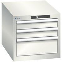 Szafki warsztatowe Lista z szufladami, 3 lub 4 szufladami. Zamek na klucz. Optymalne wykorzystanie dzięki pełnemu wysuwowi i optymalnej wysokości frontu szuflady. Doskonała ochrona przed kurzem, cieczami i uszkodzeniami mechanicznymi dzięki zamkniętej ramie z powierzchnią odporną na uderzenia i ścieranie. System zabezpieczający przed wypadnięciem szuflady oraz blokada każdej szuflady osobno. Ochrona antykorozyjna poprzez elektroforetyczne malowanie zanurzeniowe i natryskiwanie. Zoptymalizowana przestrzeń do przechowywania i organizacja dzięki przegródkom LISTA dostosowanym do każdego zastosowania oraz szufladom wyposażonym w rowki i perforacje. Profesjonalne etykietowanie z oprogramowaniem LISTA Script i odchylanym uchwytem na etykiety. Idealnie cichy ruch dzięki prowadnicy bez poprzeczki Przegródki do szuflad nie są dołączone. Należy je zakupić osobno. Maks. obciążenie (kg) : 75 kg